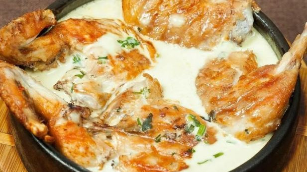 შქმერული - არომატული შემწვარი ქათამი ნივრისა და რძის სოუსში.